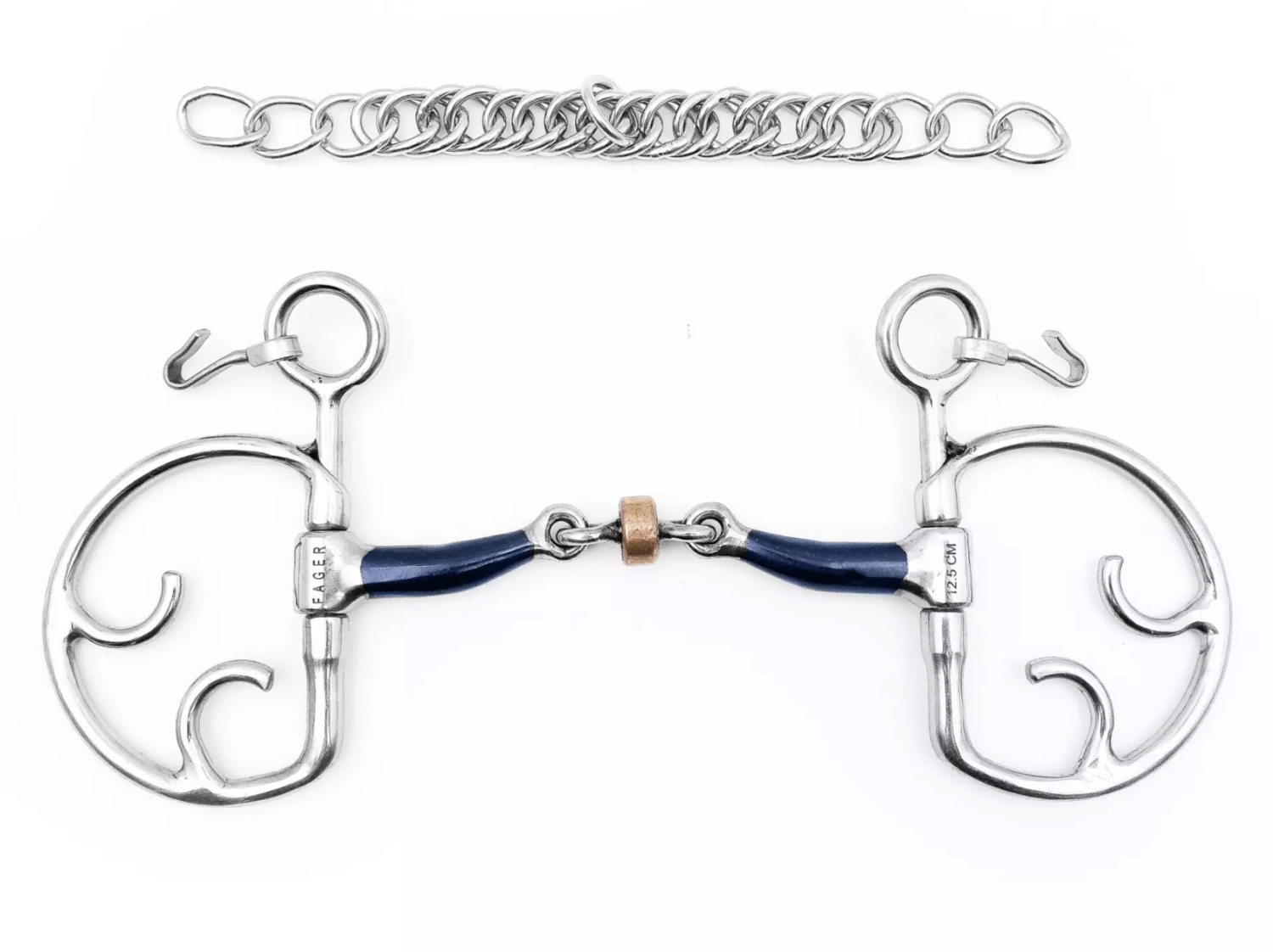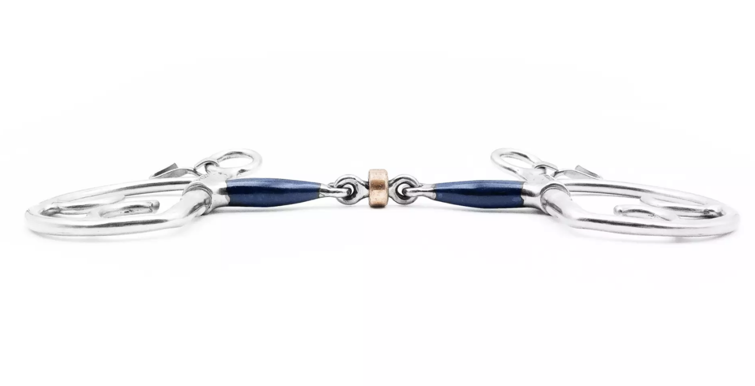 Mundelen är designad att följa hästens naturliga utforming och ge mindre konstant tryck. Koppar rullen är högre än sidodelarna, vilket ger punkt-tryck mot tungan vid högre belastning. Detta hjälper dig att enklare och smidigare kunna plocka tillbaka och återgå till ett mjukare stöd fram till handen.