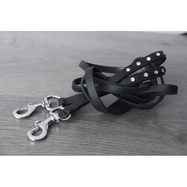 Tyglar i biothane. Vid hakarna är det läder med 5 diamanter. Hakar i silver.