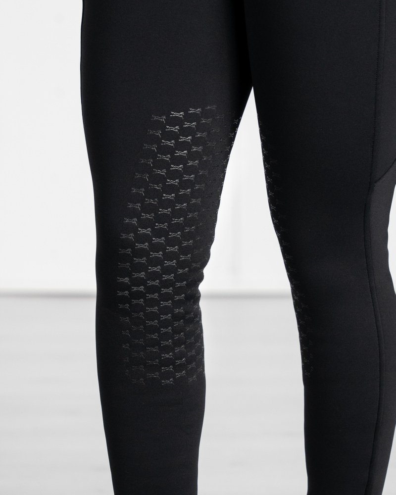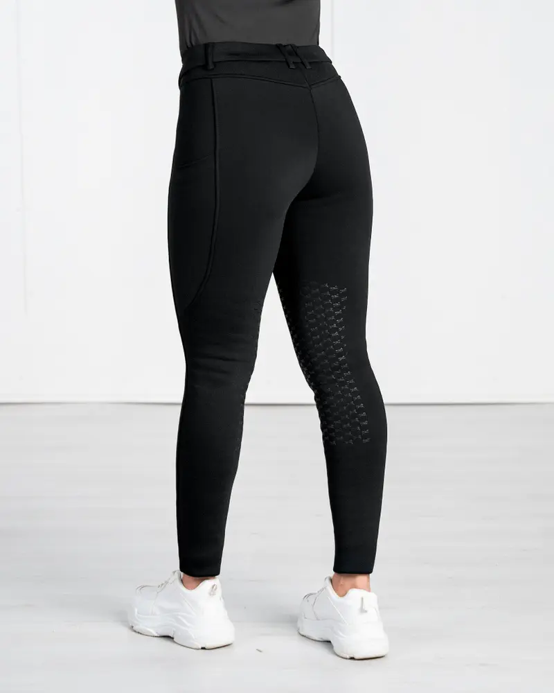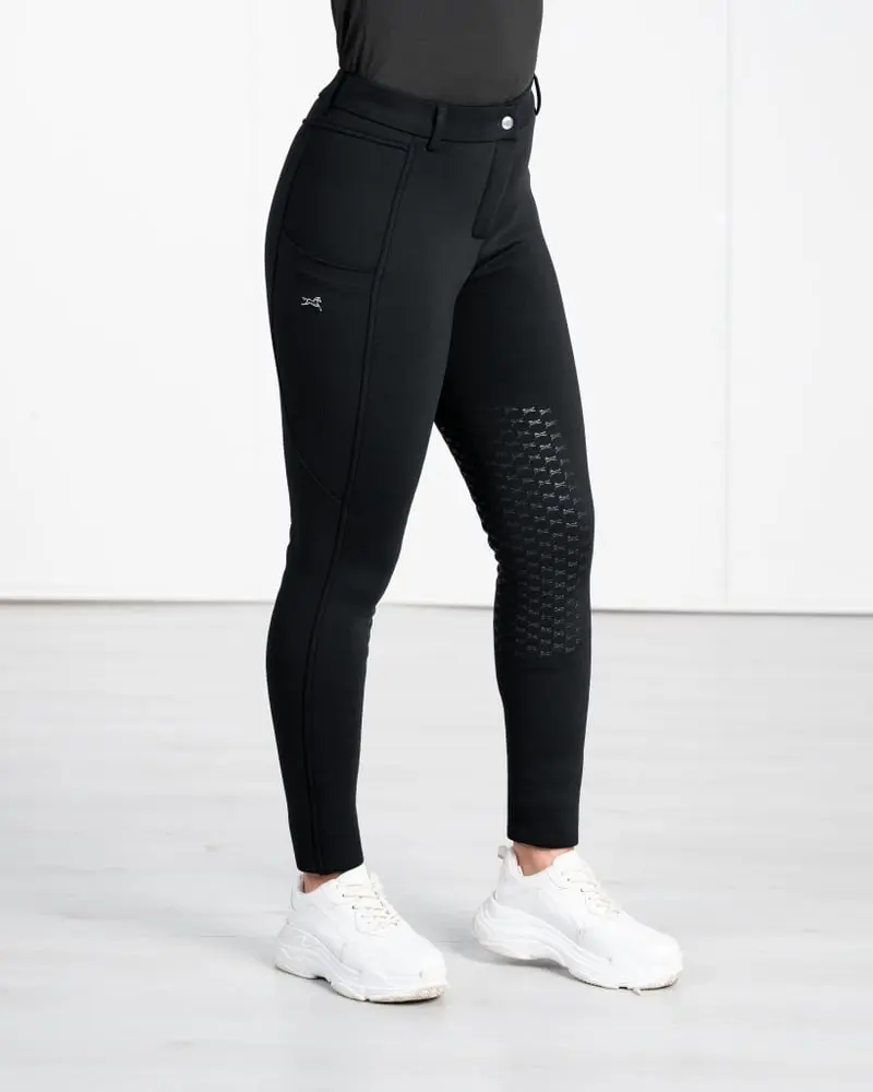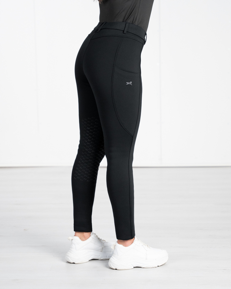 Den mellanhöga midjan med dragkedja fram och klassiska bälteshällor ger en perfekt passform, samtidigt som den stilrena designen gör att du ser snygg ut – oavsett om du tränar eller tillbringar en lång dag i stallet.