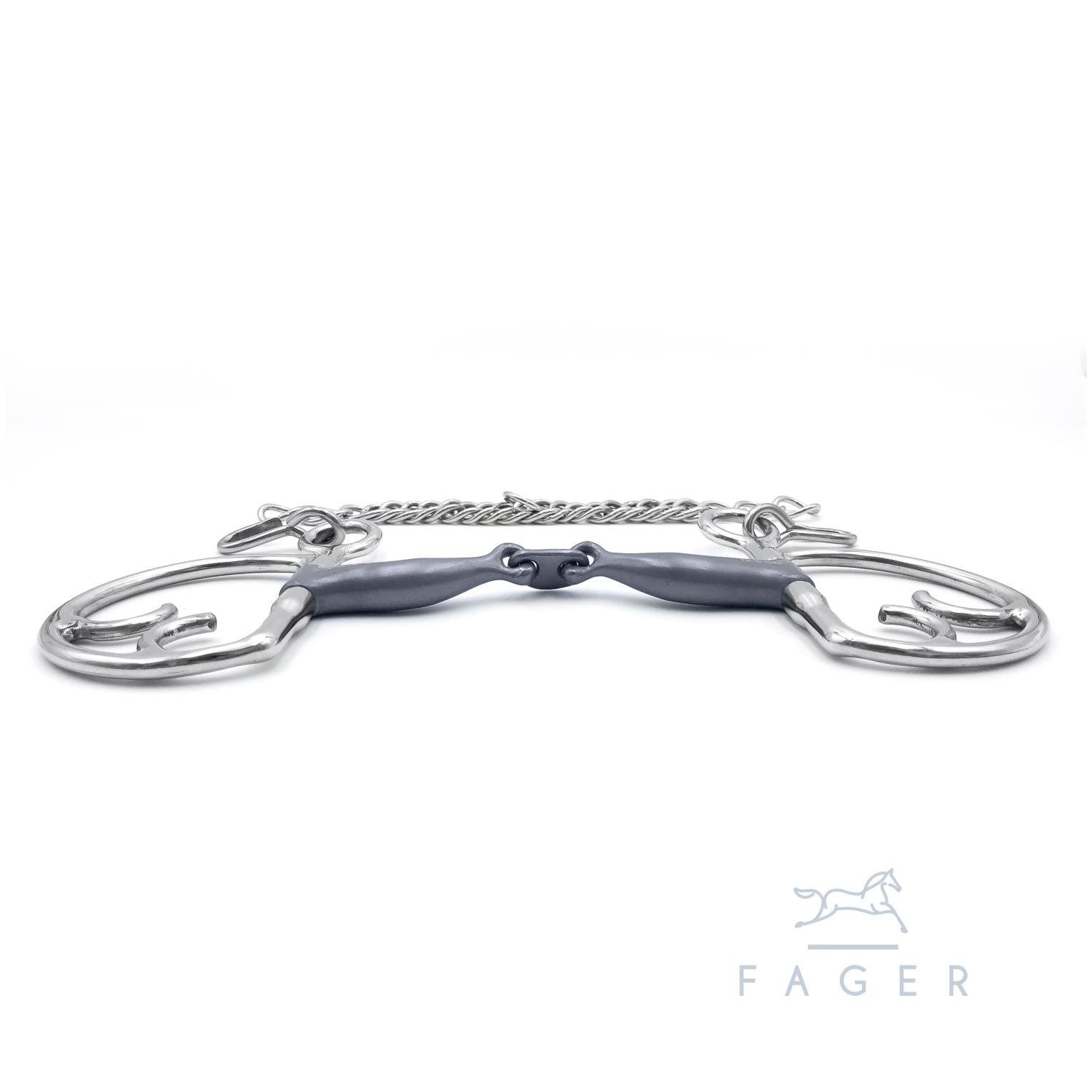 Mundelen är designad att följa hästens naturliga utforming och ge mindre konstant tryck över tungan. Utforminingen i kombination med kort mittplatta tar upp lite plats i munnen och ligger inte ann och irreterar en redan känslig häst i onödan. Den lätta vikten gör det mindre stumt och ökar acceptansen.
