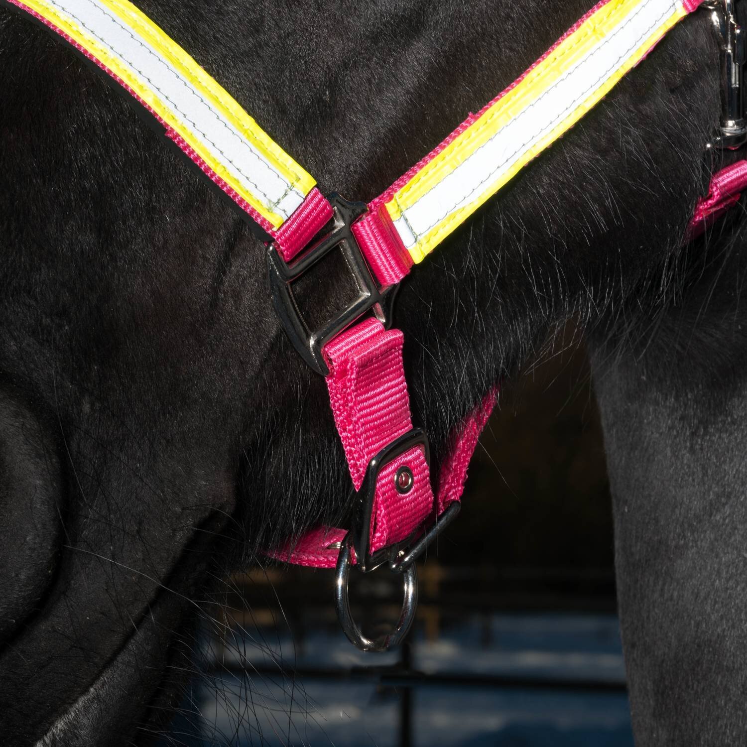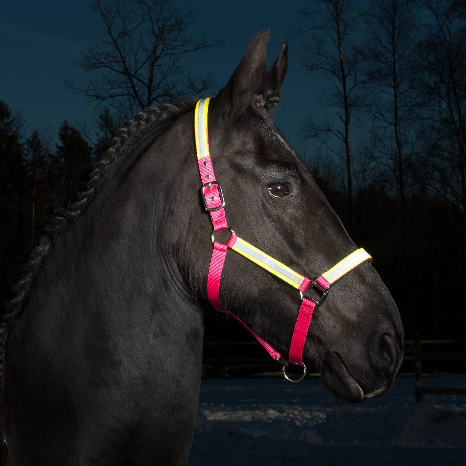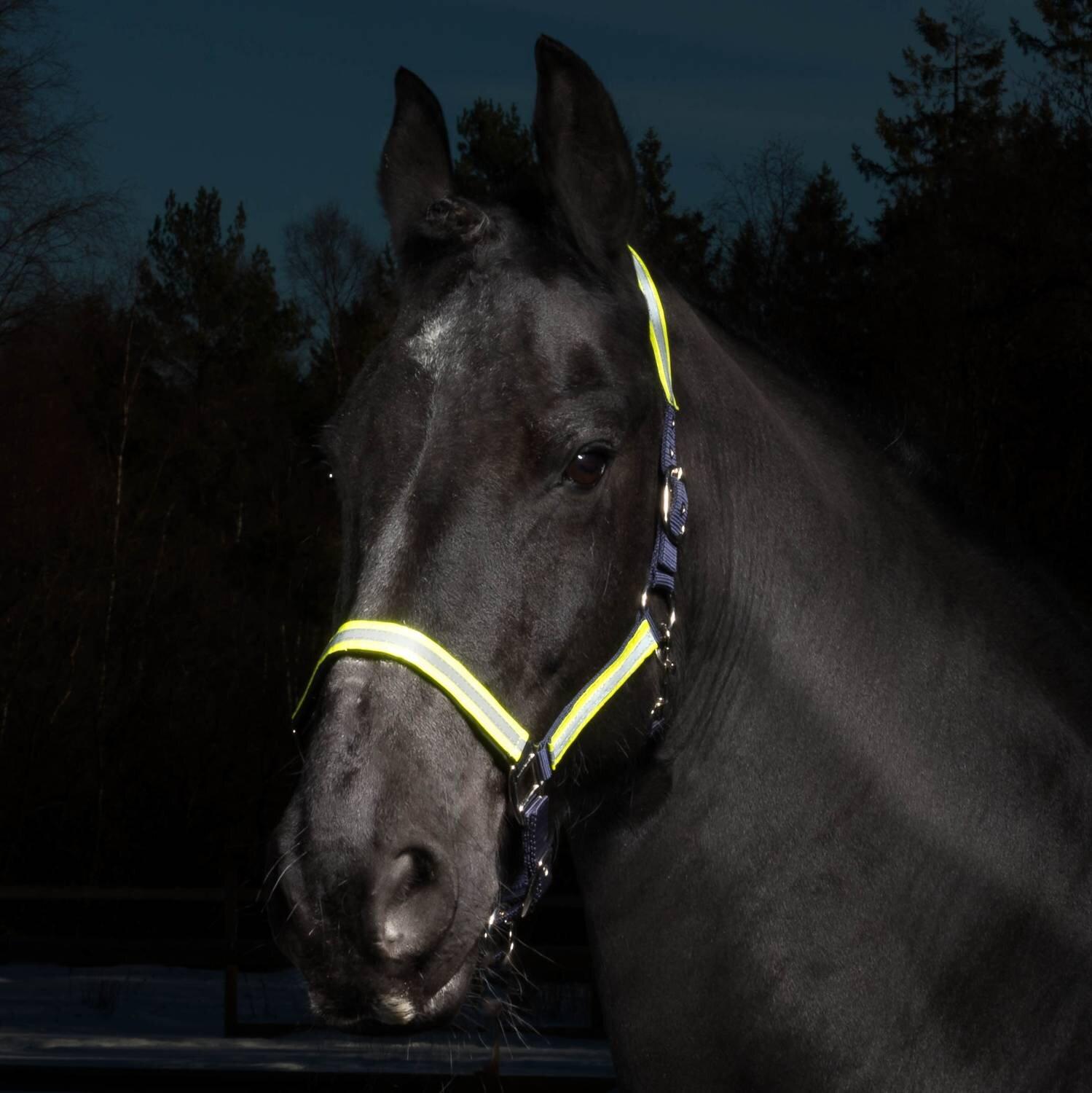 Gimma i nylon. Reflexmaterial på sidor, nos och nackrem. Justerbar vid nos och nacke. Hake på käkrem.