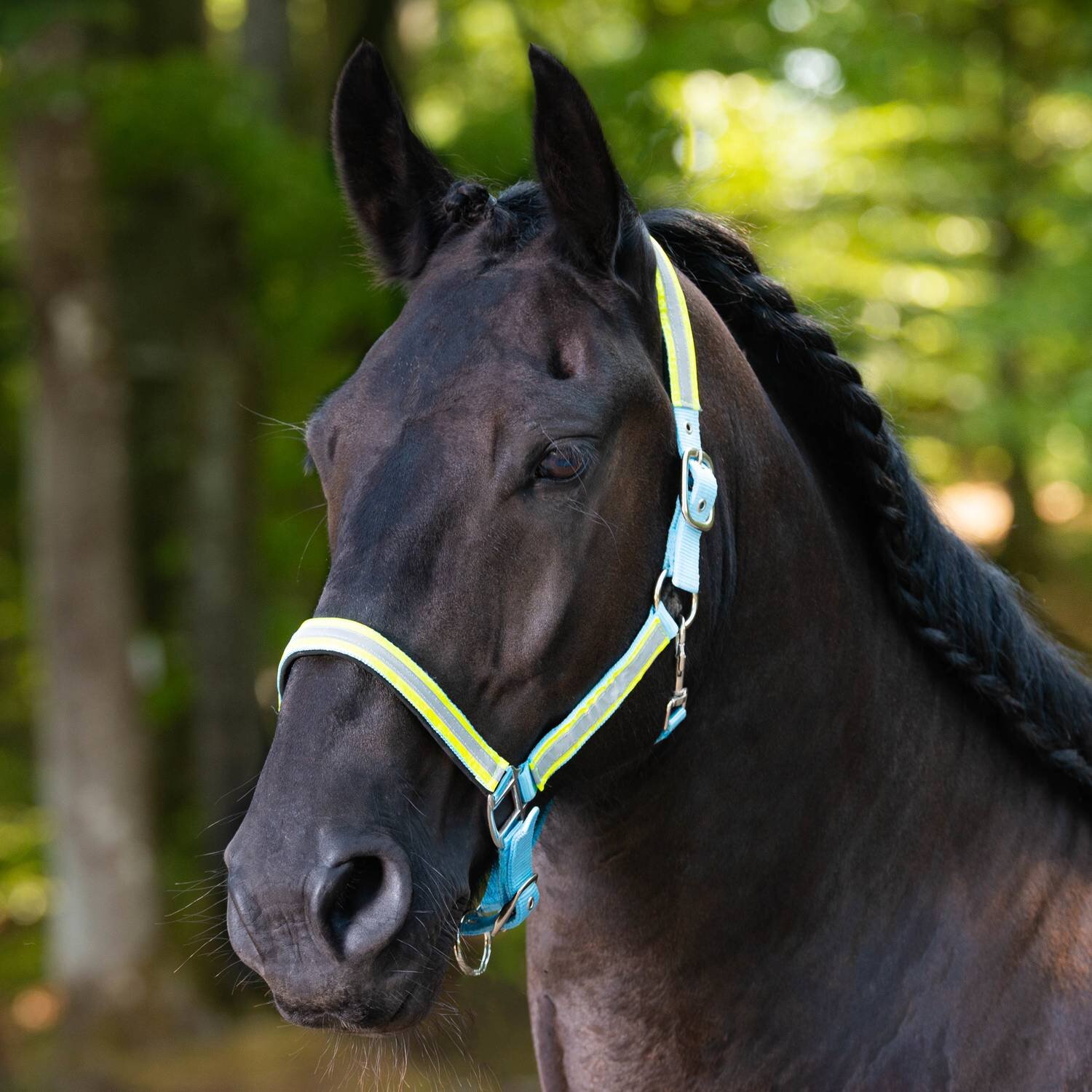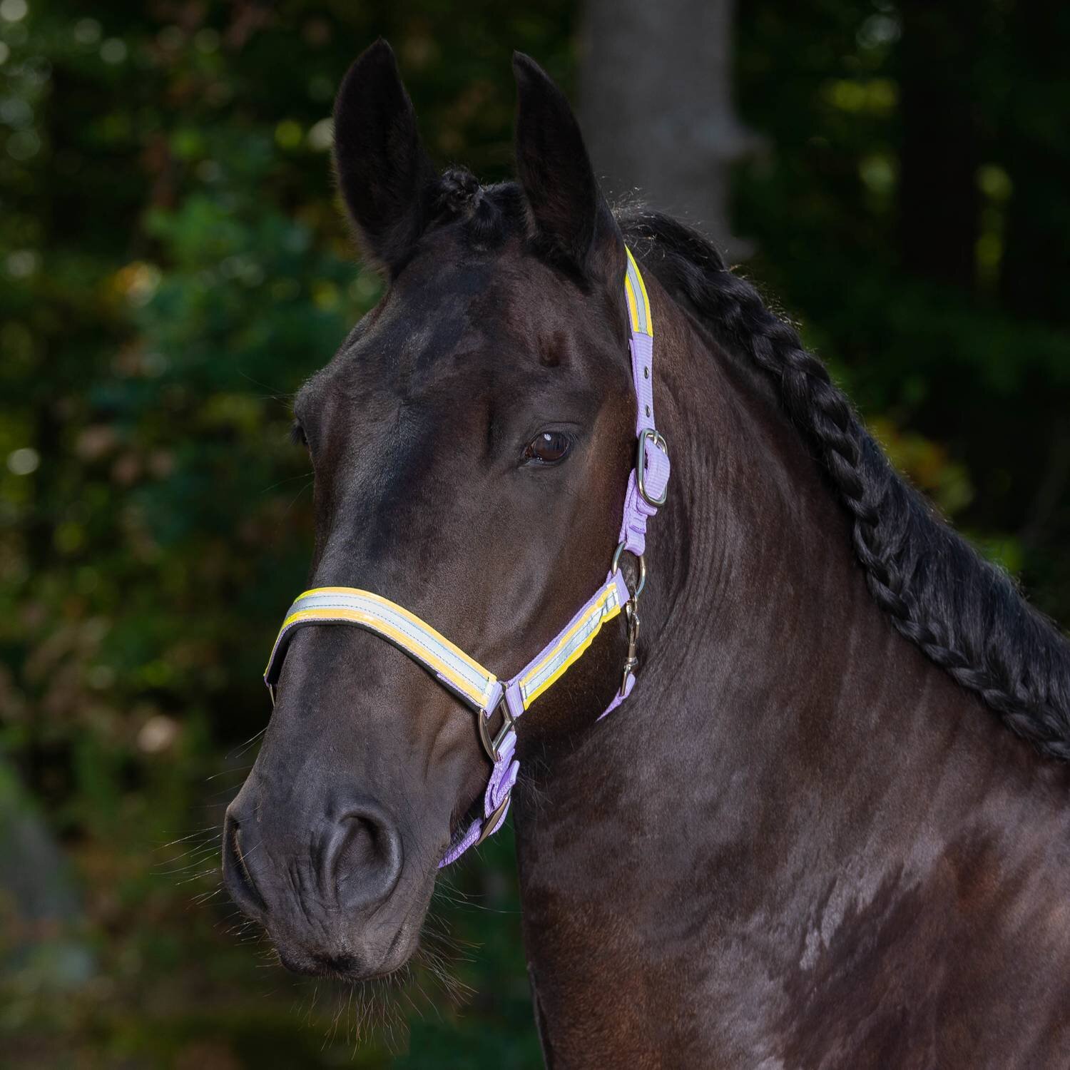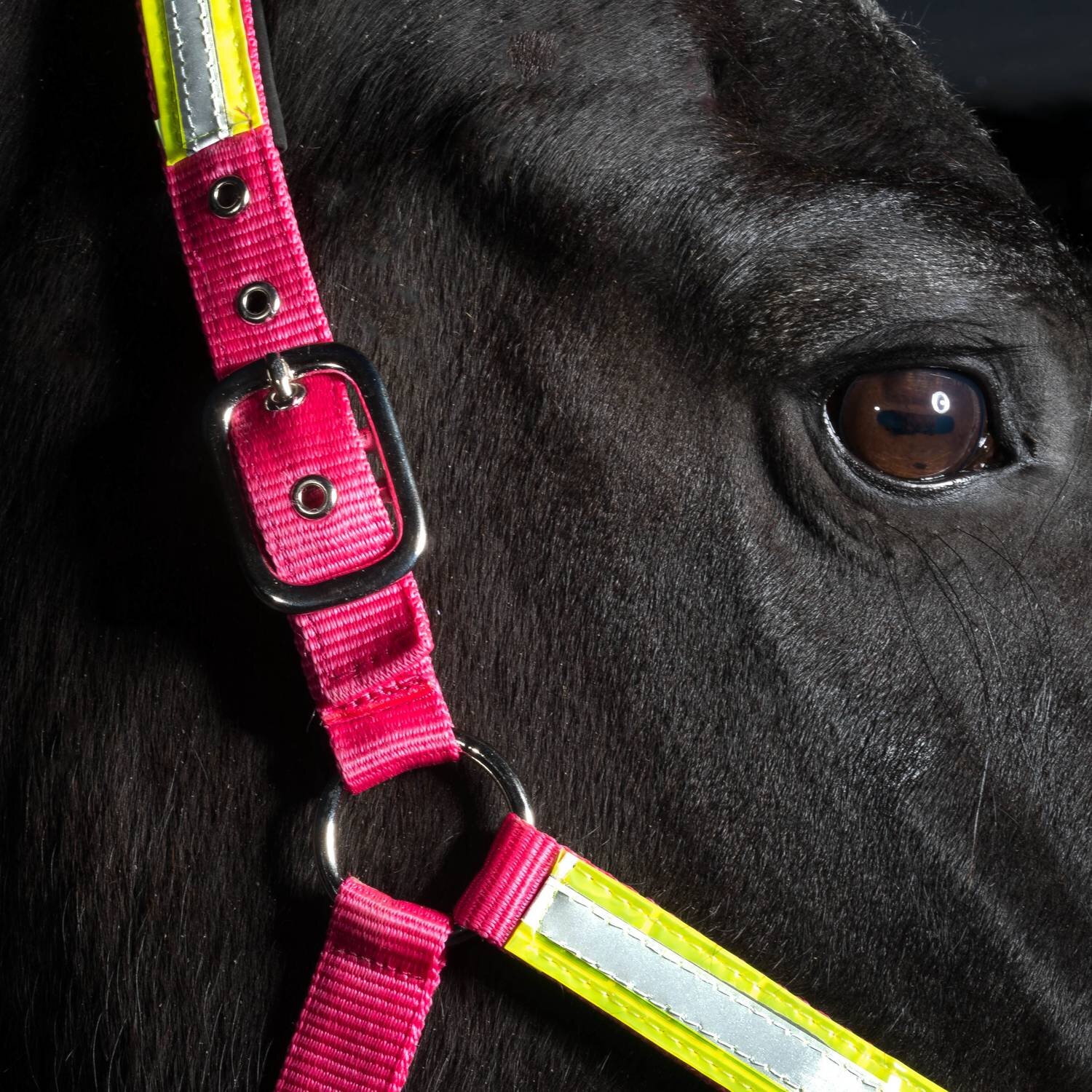 Gimma i nylon. Reflexmaterial på sidor, nos och nackrem. Justerbar vid nos och nacke. Hake på käkrem.
