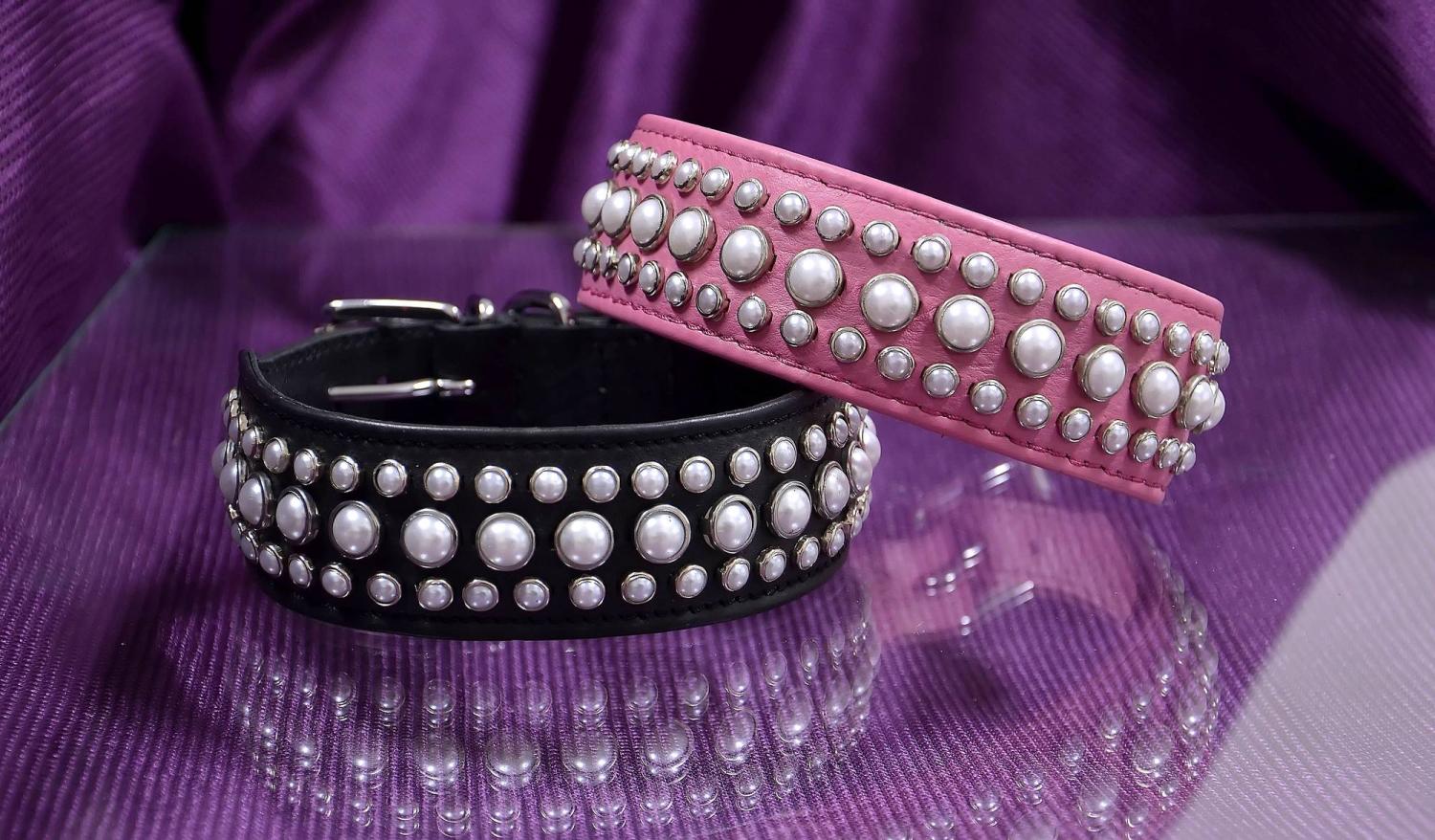 Hundhalsband i mjukt kalvskinn med stora och små pärlor