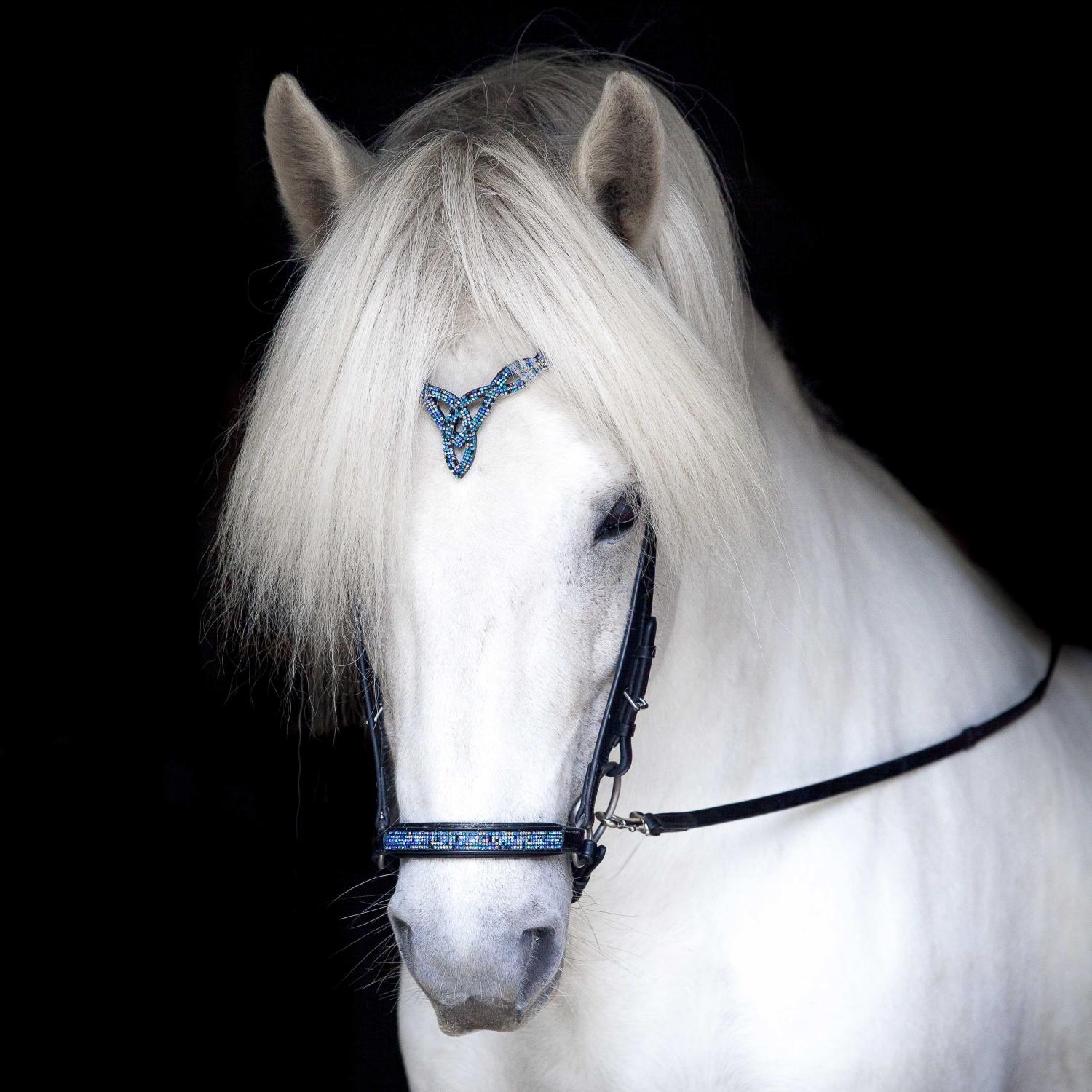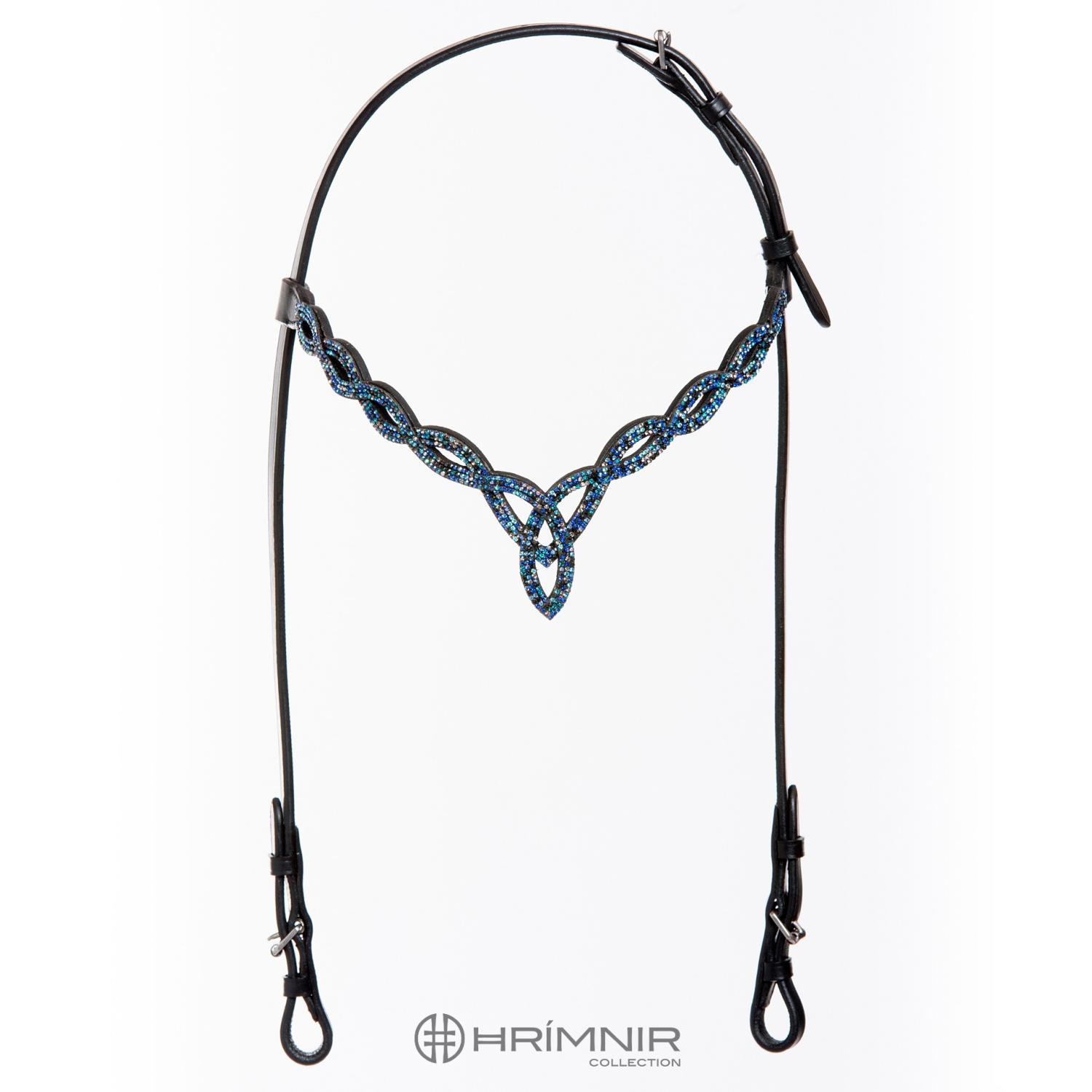 Supersnyggt huvudlag och pannband med handplacerade och mixade blå kristaller från isländska Hrímnir. Svart, mjukt kvalitetsläder med spännen i rostfritt stål. Storlek Islandshäst. Mått tvärs över, från bettring till bettring max ca 102 cm. Pannband tvärs över ca 38 cm.