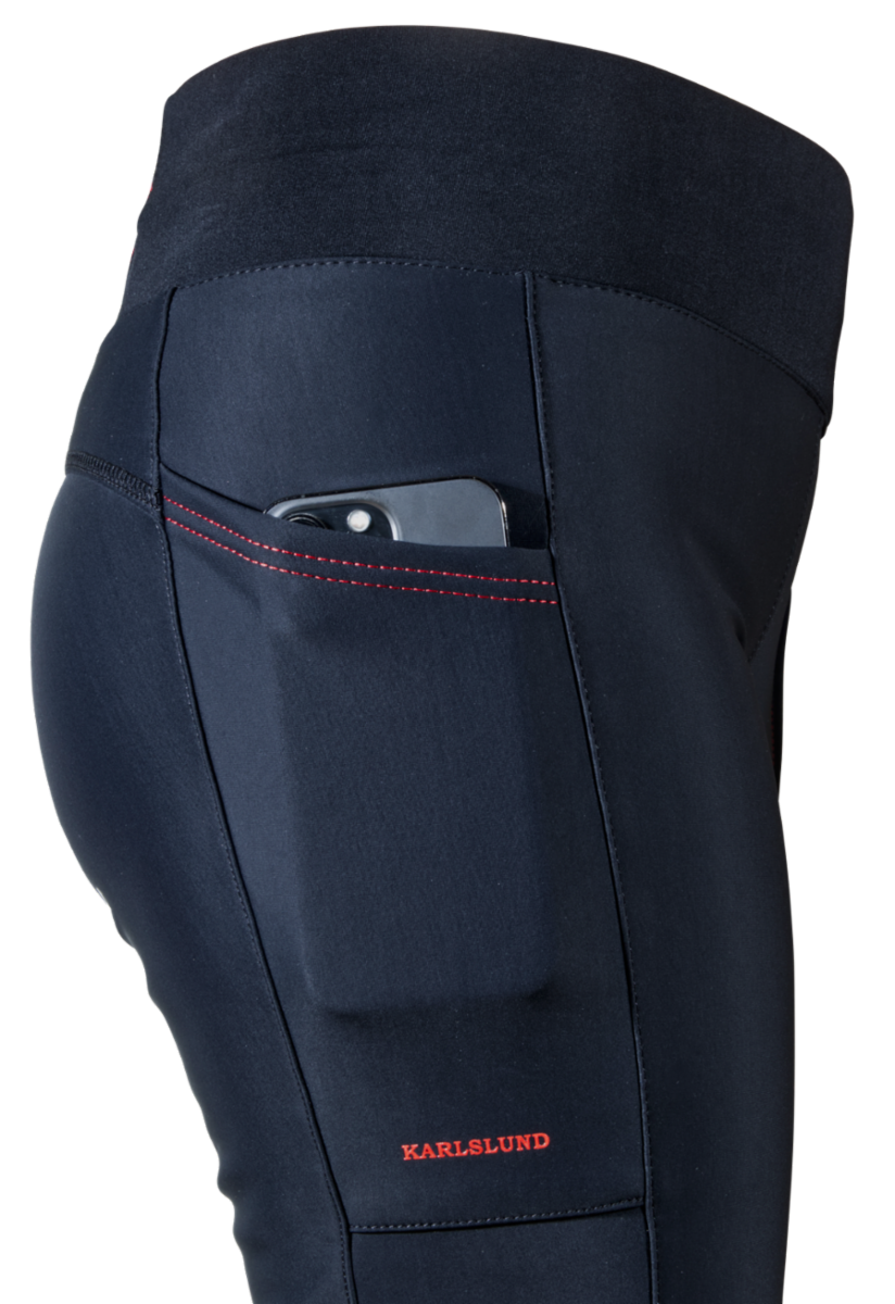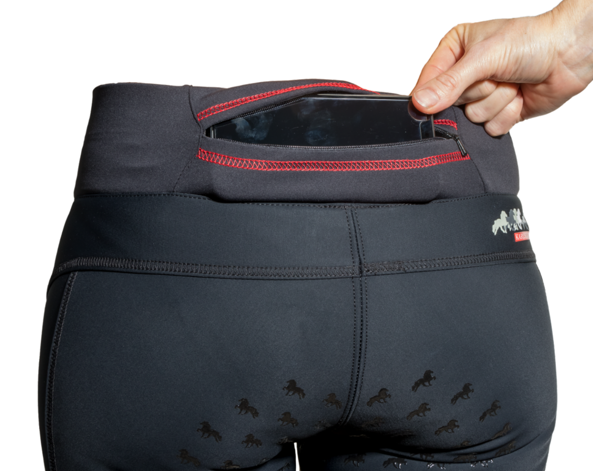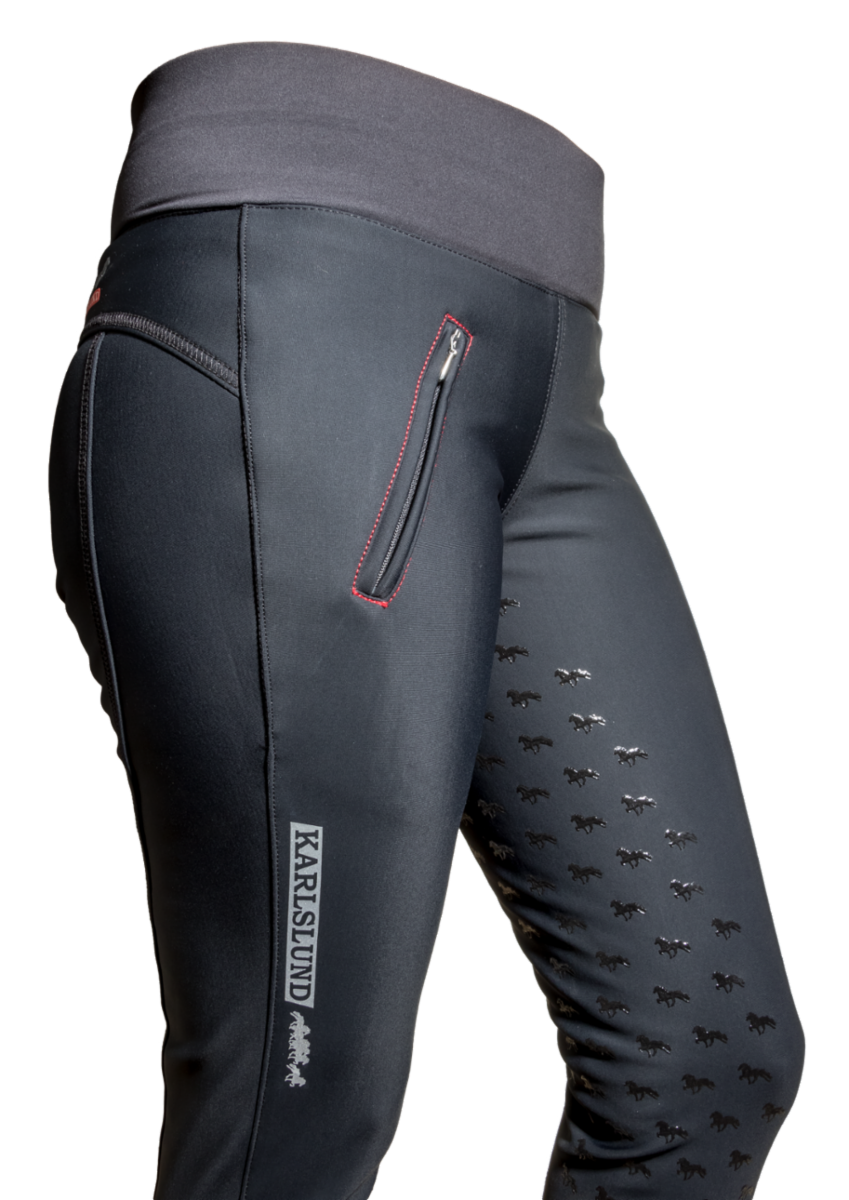 Mycket snygg design, utan sömmar på insidan av benen, och silikongrepp på benen och ryggen, i ett mönster av islandshästar, hjälper ryttaren att sitta bra i sadeln. Integrerade praktiska fickor på höften och nedre delen av ryggen, med plats för mobiltelefon eller liknande.