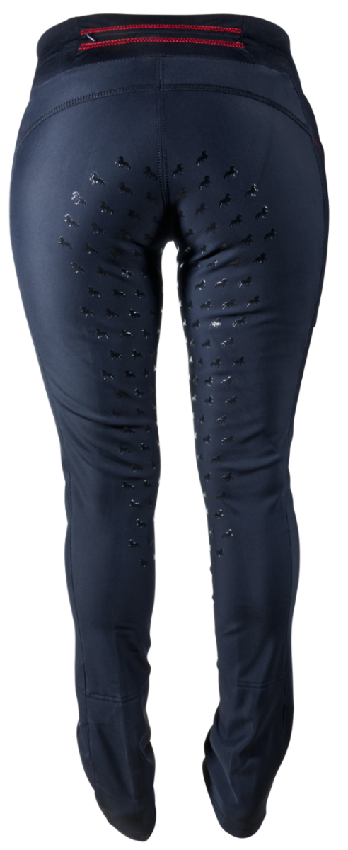 Designen är både elegant och funktionell, utan sömmar på insidan av benen för att undvika skav. Silikongrepp i sätet och längs benen, i ett vackert mönster med töltsättande islandshästar, hjälper ryttaren att sitta stabilt i sadeln.