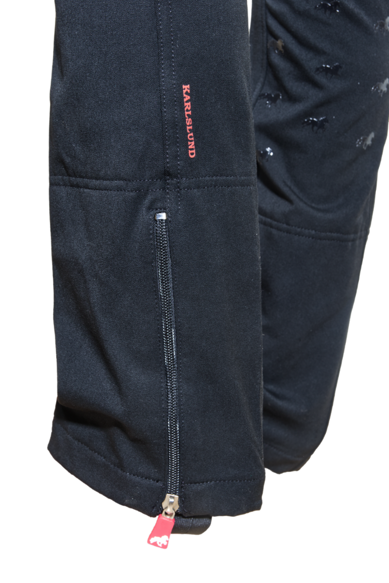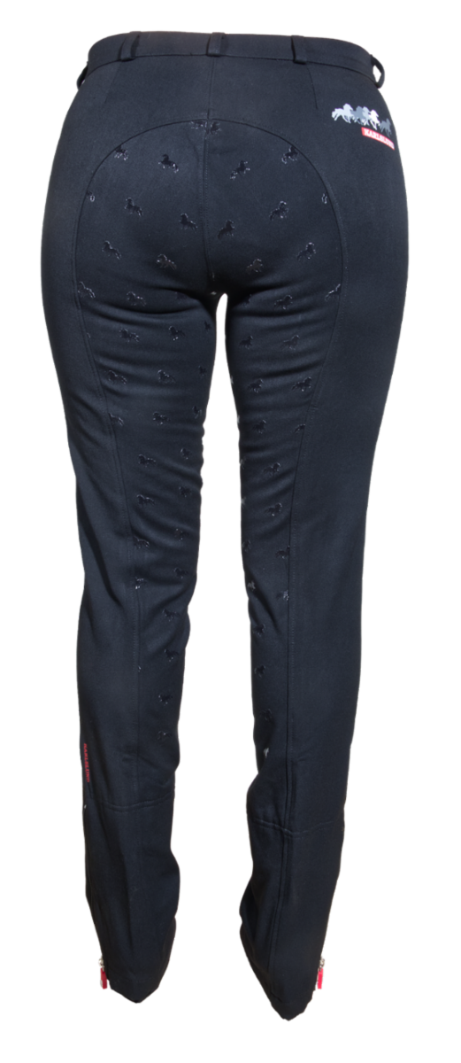 Det dekorativa silikongreppet med töltande islandshästar ger ett säkert grepp i sadeln, medan dragkedjan baktill vid vaden ger extra plats för boots eller ridskor under byxan.