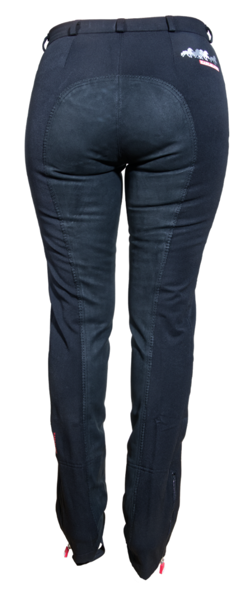 Byxan har helskoning i äkta Clarino – ett material som ger både lyxig känsla och optimalt grepp i sadeln. Dragkedjan baktill vid vaden ger extra utrymme för boots eller ridskor.