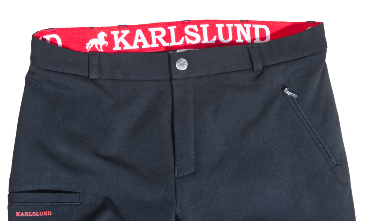 Blixtlås nertill, extra stor ficka med blixtlås för tex. mobiltelefon, snygga Karlslundsloggor som detaljer.