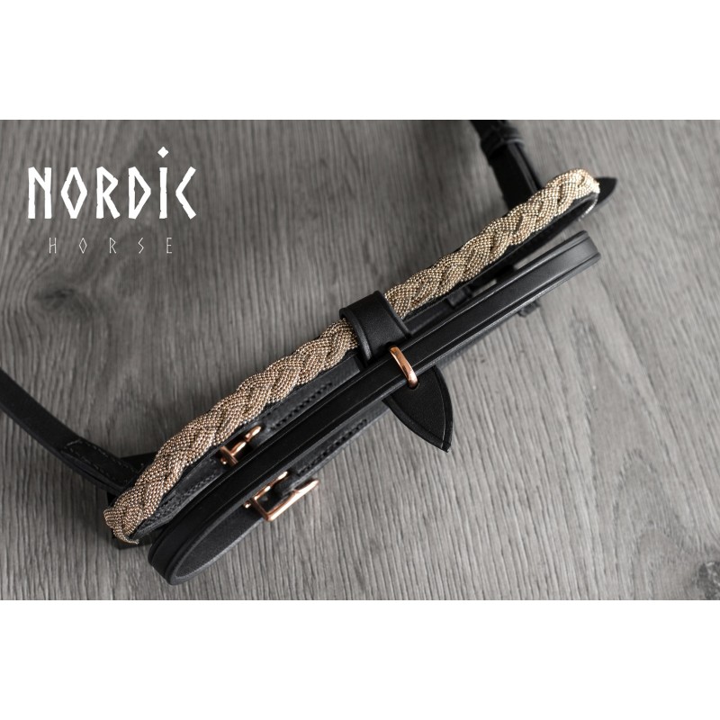 Kombinerad nosgrimma i svart kvalitetsläder med flätad metall. Passar islandshäst.