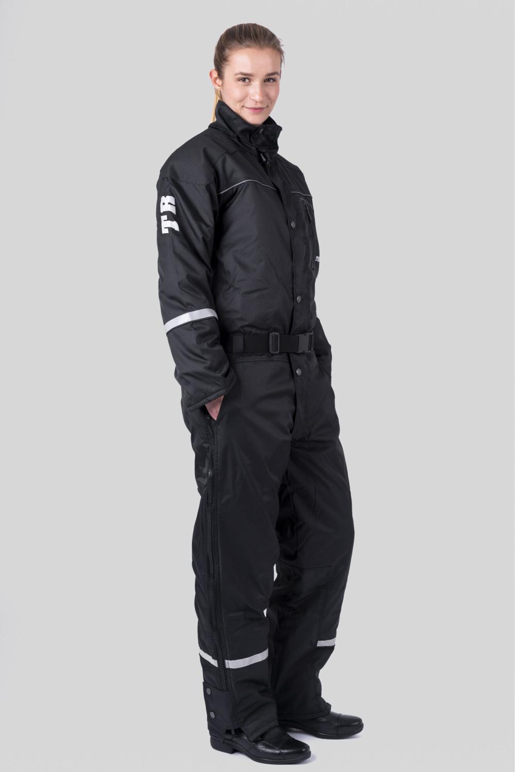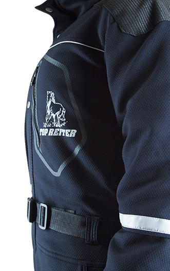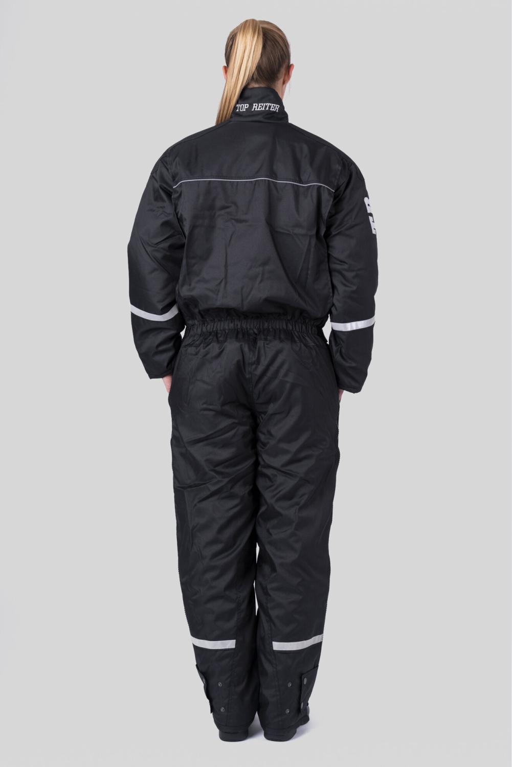 Varm och snygg rid eller stalloverall från Topreiter, med logo på bröstet och ryggen. Svart/grå med flera reflexer. Ingen skoning. Dragkedja på benens yttersida, innerficka, bälte och fothällor. Unisex storlekar.