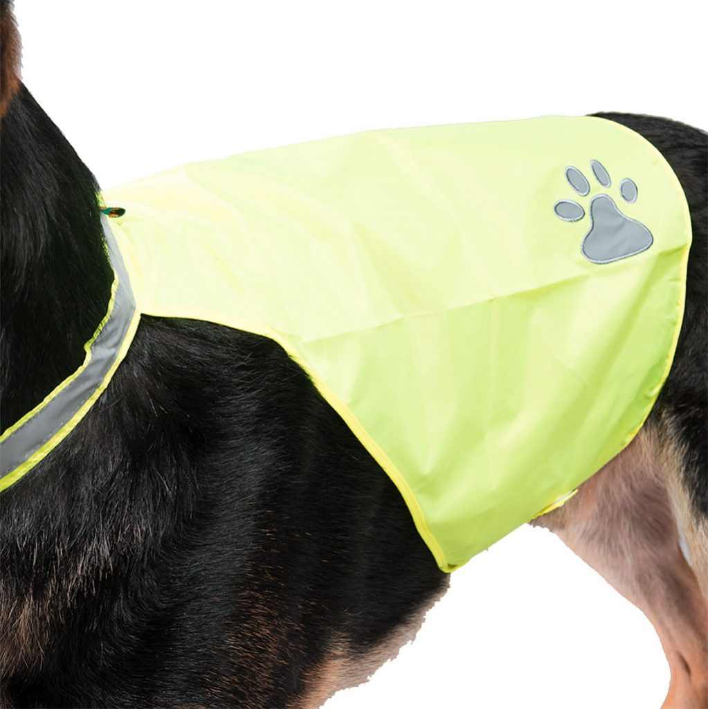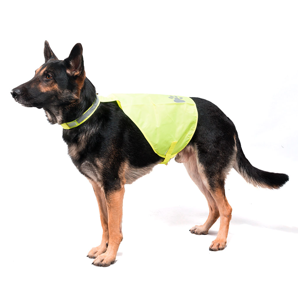 Fluorescerande, maskintvättbar reflexväst som ger både dig och din hund ökad säkerhet, såväl i mörker som i dagsljus. Kardborreknäppning vid hals och bröst. Tuffa tassavtryck av reflexmaterial som ger extra säkerhet och stil! Reflex i halsbandet.
