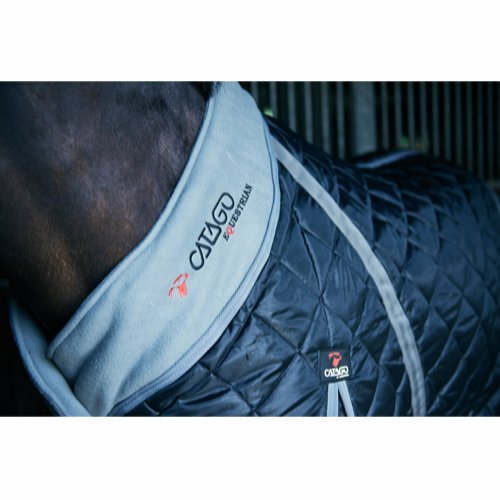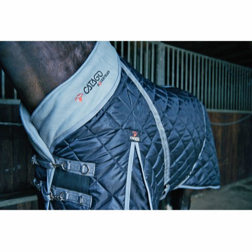 Kraftigt quiltat stalltäcke med yttermaterial i 420D och med 100 g fyllning. Täcket har justerbar dubbel frontknäppning med pistolhakar och D-ringar, bogveck, X-gjordar, benstroppar och svansskydd. Den blå breda fleecekragen med Catago-logga, gör täcket extra behagligt för hästen och skonar manen.