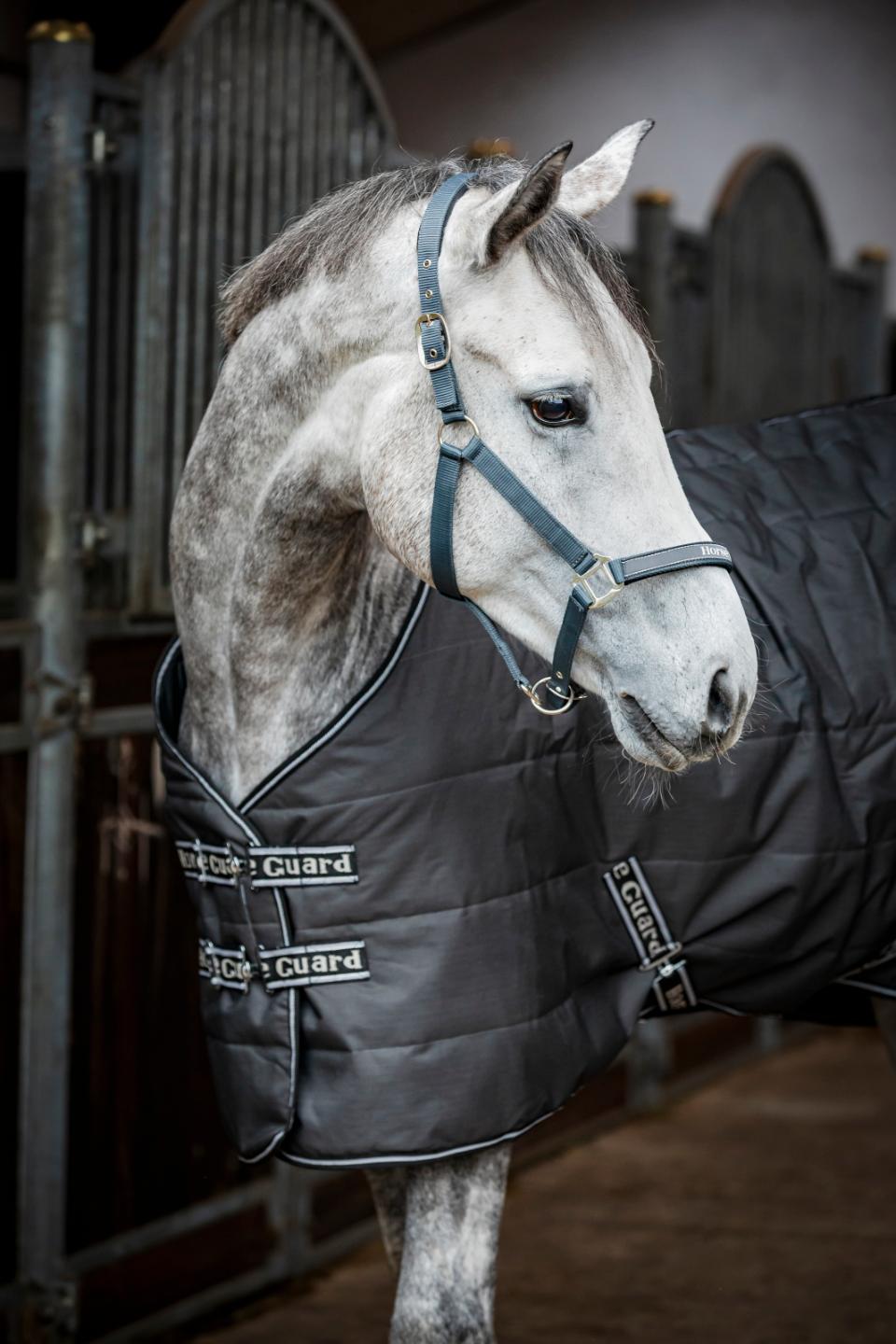 Täcket har stilrena band med kontrast- och metallicrand samt ett diskret Horse Guard-jacquardmönster. Silverfärgade metalldetaljer ger ett elegant och robust intryck. Den mjuka fuskpälsen vid manken minskar risken för skav och ökar komforten.